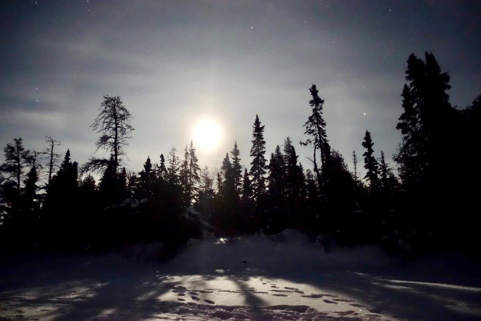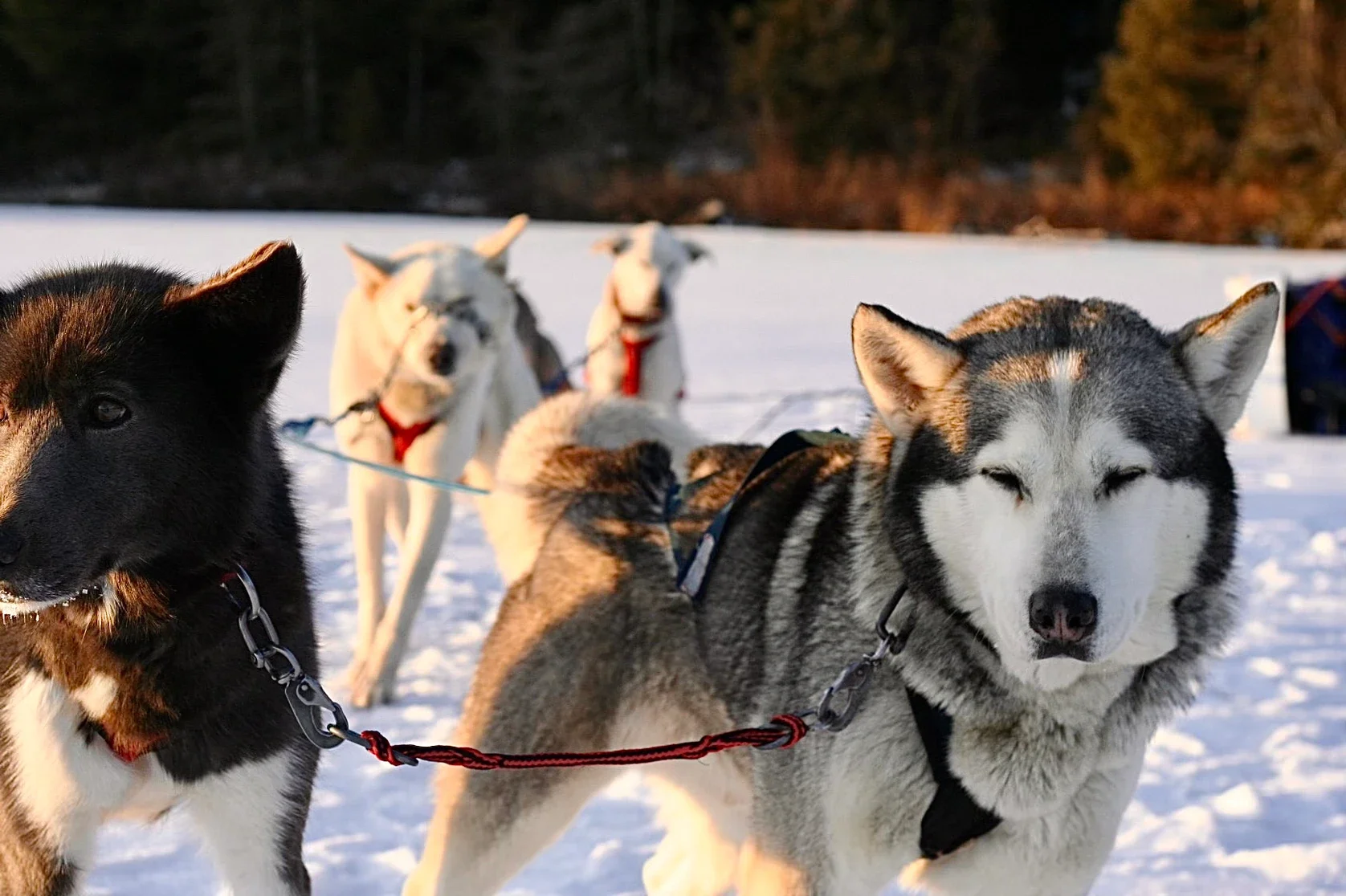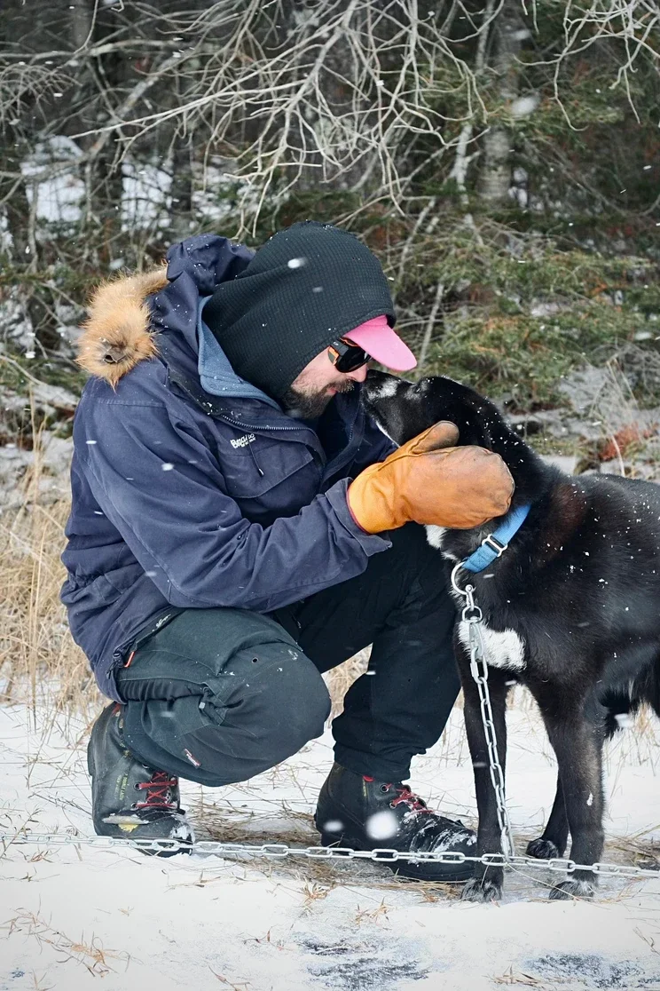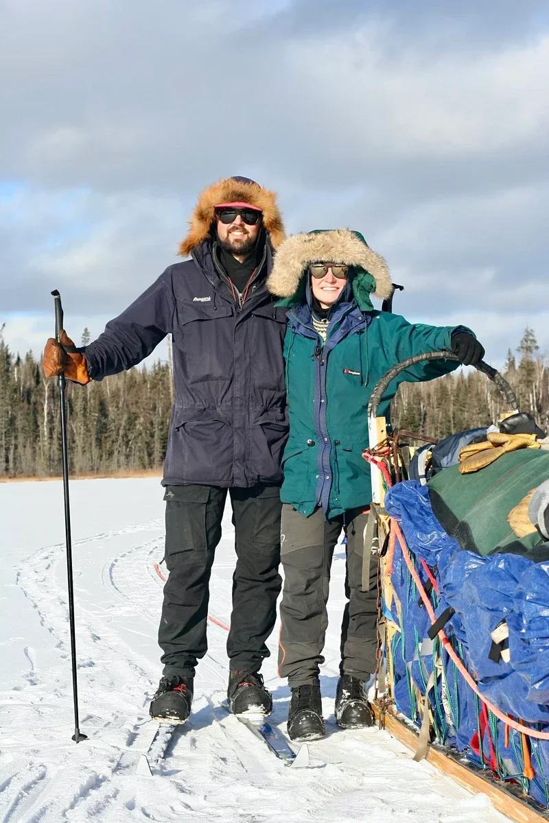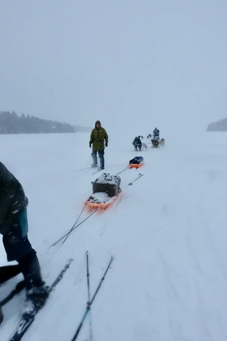 We travel across frozen lakes in two cohorts, one of the ski team and the other of the mush team, one instructor plus several students in each. The ski team travels ahead on cross country skis, pulling pulks with their gear, and chops into the ice every now and then to check thickness. The mush team follows behind, with two sleds of 5-6 dogs each sled and two people at the back. The type of mushing we do is expeditionary which means, like people have done for hundreds of years in this area, we are traveling with all of our gear to survive in below 40 degrees F/C. This means each sled can weight up to 500 lbs full of human and dog food, shelters, kitchen gear, personal gear, an emergency hot tent, and other bits. Our dogs are built and bred for this and to live in these conditions. They truly love to work and we love them deeply, they are the best co workers I’ll ever have.