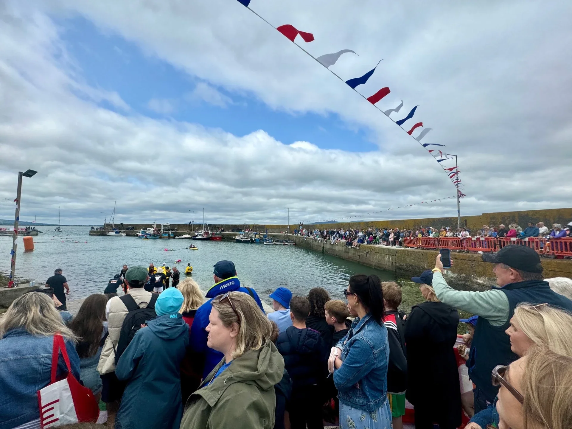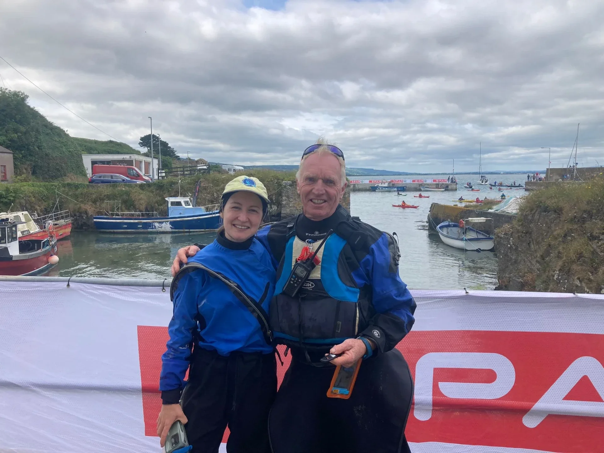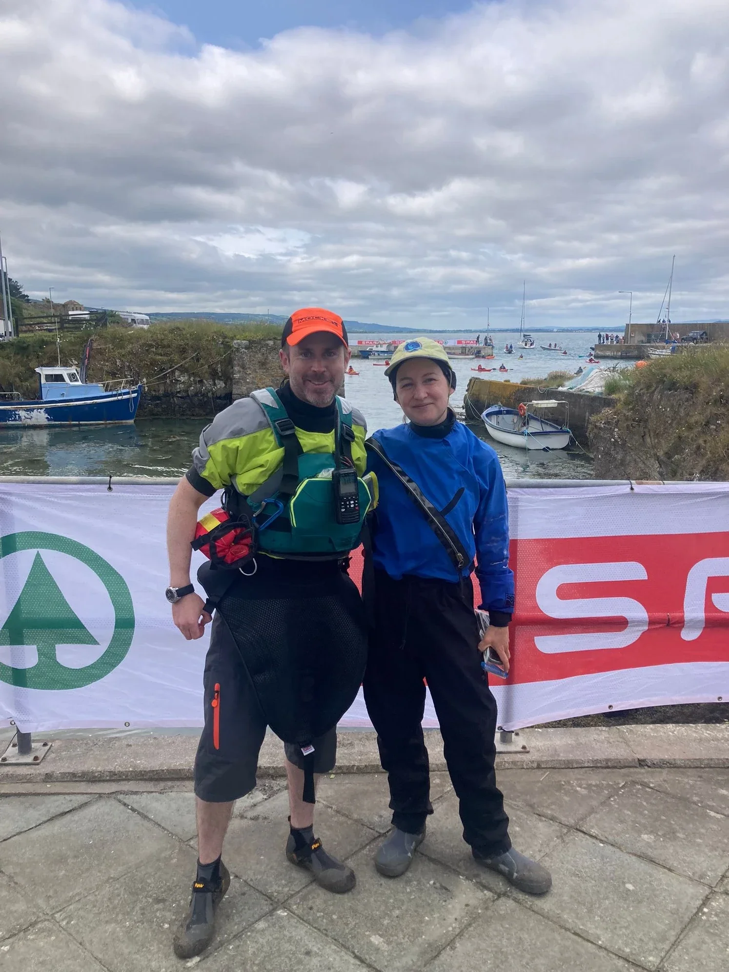 That was the first time I had seen paddlers on the water besides Mic but he was going fast so we didn’t chat. Was taking my time because I was meeting up with Peter and Anthony while they escorted the swimmers for the 4k swim across Dungarvan for an RNLI fundraiser. Such a cool event to see so many swimmers and paddlers along side and other small craft of the outside. I scooted ahead so I could use the bathroom and fill up water and was going to head off but waited until they got in. Chatted with a paddler who had done the go around in 2007 so that was nice. The table of tea and sandwiches for swimmers gave me some sustenance so that was nice of them. When the lads got in, I was announced on the loud speaker that I was doing this trip and as well when I was leaving the harbor which was sweet to have some encouragement.