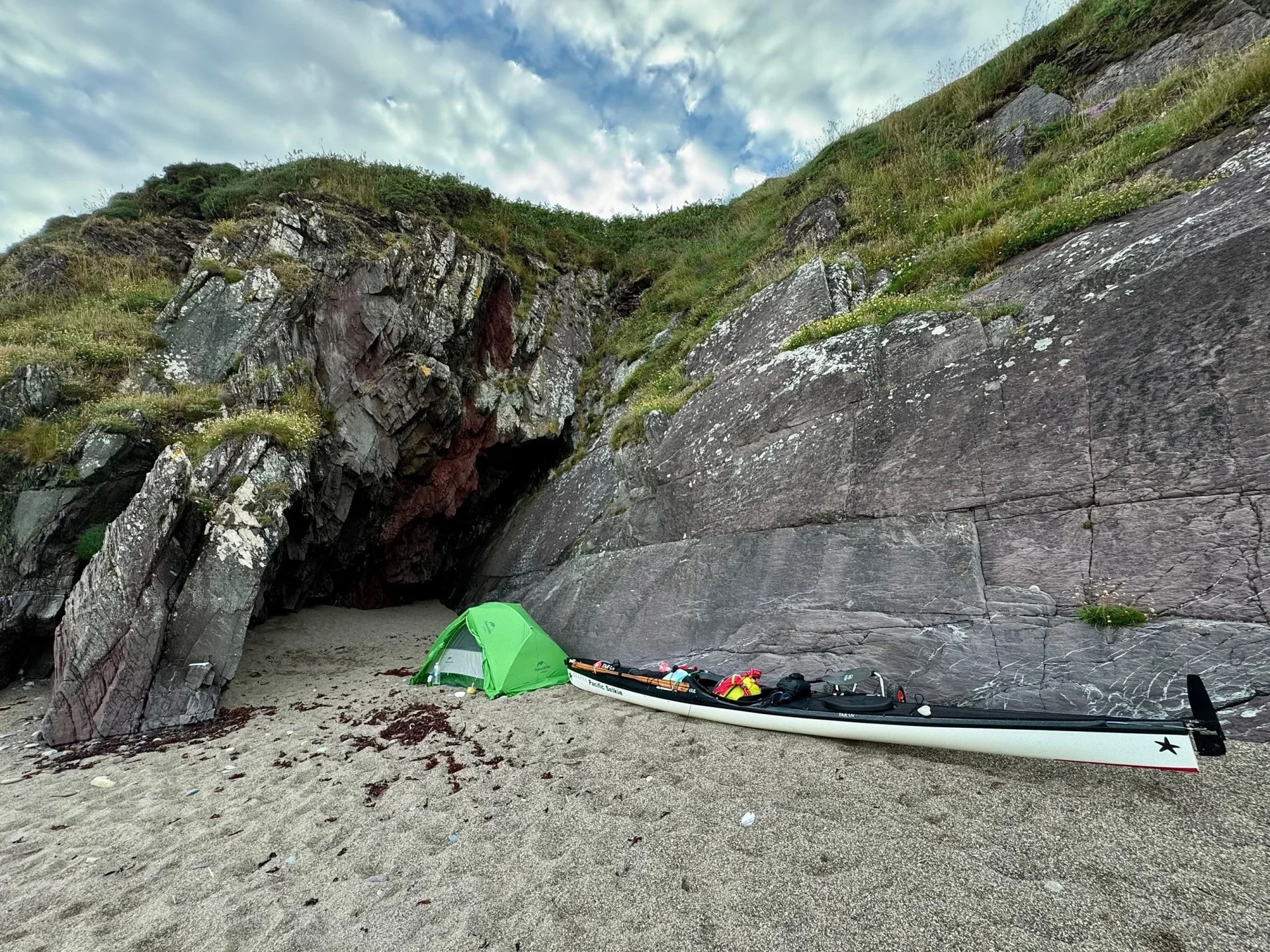 Plus sometimes it’s a long stretch before I can actually land and the thought of peeing my dry suit just sounds so awful. Then on the other hand, I’m trying to fuel my body off of ramen noodles and dinners that just take boiling water to “cook” rice or noodles. Which I can absolutely do on a shorter trip, but this is not the same. Not good. Paddled past the old ship wreck called Samson that was a British crane barge that ran aground in 1987 at the cliff. So I was floating and paddling over a sunken ship. Spooky. Got into Caliso Bay near Youghal, on a short day because I just felt so exhausted. I got my stuff up into a bit of an overhang and just laid down for quite a while. Today is the day where I’m thinking “this is hard, my food is gross, my body hurts, I’m out of toilet paper so I hope I don’t need it, I wish I had some company” and all the rest of it. But that’s totally part of this. Sunset was really beautiful though, and I started to feel less headache and fatigue. Going to sleep early to catch a low wind morning.