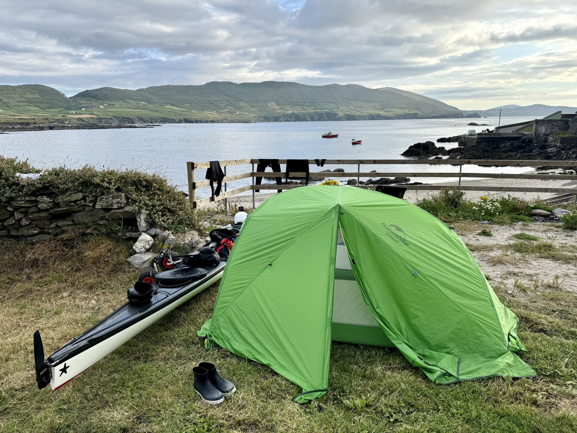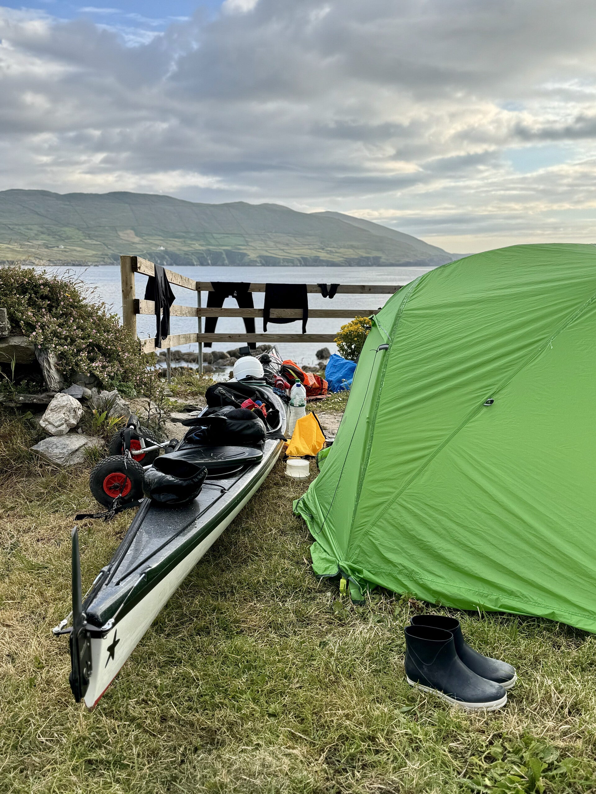 Finally I rounded into Dursey Sound and it was so flat and still, just perfect. I went under the Dursey Island cable car, the only cable car that goes over salt water in Europe, and carried on. Called my friend Ben as I paddled to the Allihies beach campsite and it is just stunning here. Beautiful beach, a coffee truck, sauna, and the best of all - facilities. Now that I’m near Kerry and into the west coast, things become more few and far between so I’ve taken the advantage to charge things, shower, hand wash my paddle base layers and will fill water in the morning. It’s a delightful spot. There’s also a very handsome and kind Danish guy who came up to talk to me and we kindof hit it off. He is doing a bit of a coastal cycle trip until September so who knows we might even meet up again. We sat in my camp spot and we watched the evening light and chatted for a while, he’s a play writer and likes to go on outdoor adventures too. He saw me paddle under the cable car. We are having coffee in the morning.