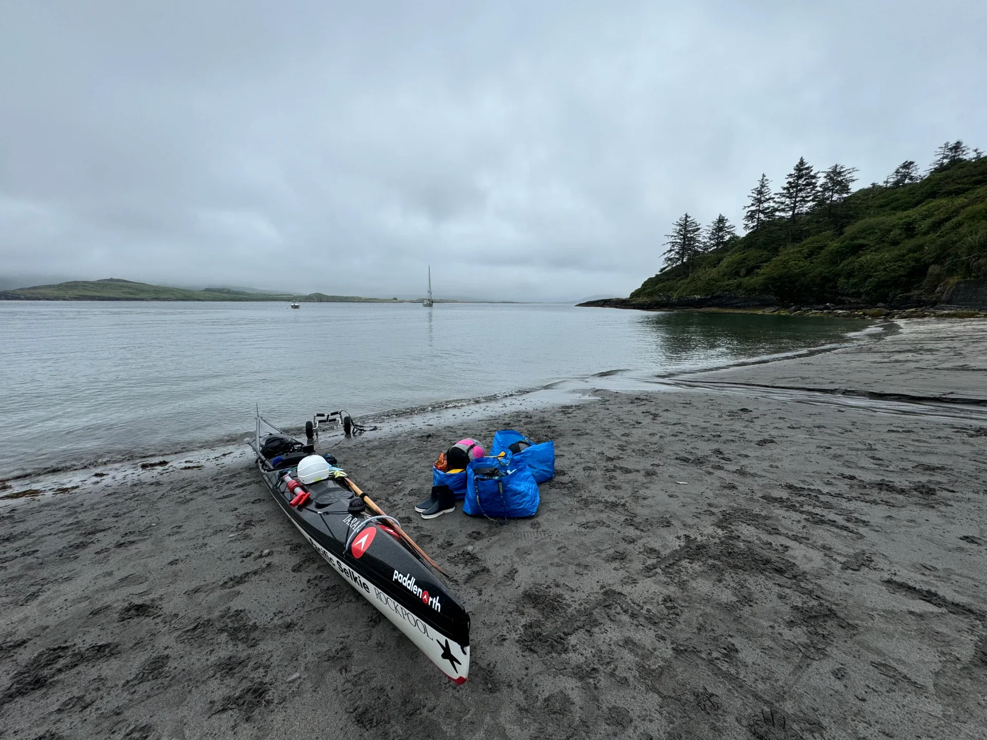 July 24, Day 41. Rained hard last night so it made it pretty hard to get out of the tent. Very foggy and dramatic day. Saw loads of puffins in the water bobbing around like little rubber ducks in a washing machine in the swell and chop from puffin island to the entrance of Portmagee Channel where Valencia is. Very grateful for the channel because the swell is clapping against the cliffs and throwing me around like nothing. Sea was very alive today. Shot down the channel with the wind and tide with me and am in a moody Pacific Northwest beach where I’m camping. Gorgeous black sand beach and there is a high grass area that I could set up my tent. Walked into town for my new daily walk and got a yogurt and a hot chocolate that hit the total spot. Been raining all day so it was appreciated. Walked back to my tent and enjoyed tortellini for dinner.