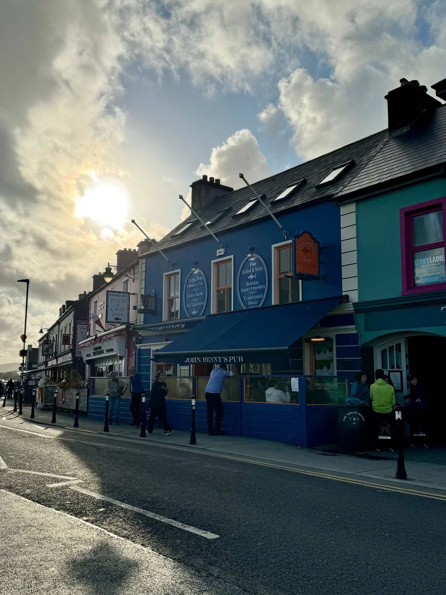 After the crossing it absolutely poured for 10 minutes then was immediately blue sky and beautiful sun for the rest of the evening. A classic Irish summer event of weather. The sun meant I was able to dry out my tent and other things because I’ve been a bit wet the last couple days of rain. A lovely 2 families on holiday and of lots of kids came down to the beach and chatted with me for a while, the young girls of maybe 7-8 were so excited I was doing this and that I was from America. They even took a picture with me while they held my paddle for their scrapbook. They offered me a lift to dingle after I asked about the bus so it was just wonderful to walk around and see the iconic town, as well as got a hearty beef and mashed potatoes meal and a couple pints between the pubs with music. Great music all around, it’s what this town is known for. Just amazing talent and voices. Met the lads at the last pub and had one more before going back and they drove me down to the beach, close to where they are staying. Just such a wholesome day.