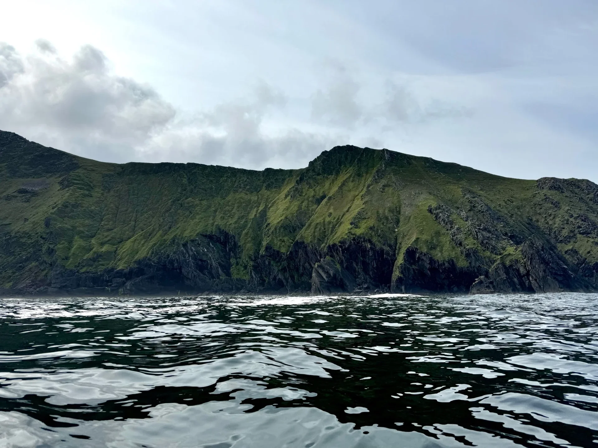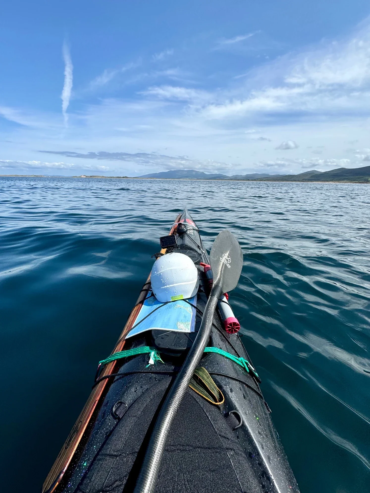 July 30, Day 47. Said goodbye to Lisa and her little dog, and set off towards the cliffs before Brandon point. So much more calm and very little swell compared to yesterday. All was just fine, wind behind me and I went in to Swerwick harbor for a wee and then continued on. I made the decision with route to do a shorter day to set myself up for the straight shot across the Shannon Estuary to Loop Head tomorrow. I crossed the bay to the Fahermore peninsula, in the light blue still beauty of the bay, with the gorgeous green mountains of Dingle in the crescent shape around me.