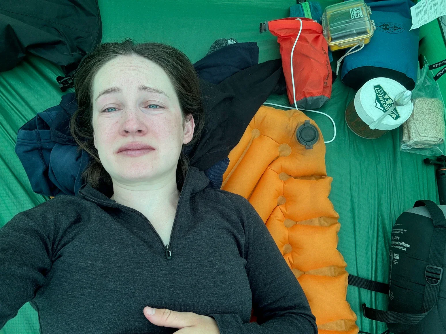 August 16, Day 64. Felt a lot of feelings today while stuck in my tent. Woke up with the intention to go to Mason and I just couldn’t do it. I very slowly packed up my things in my tent and tried to eat some breakfast over three hours. You ever have those dreams where you’re trying to walk or run or fly but your body just won’t do it and it’s like you’re moving through tar, that’s what today felt like. It’s so easy to get into your head when the wind and rain outside are making your tent feel small. Still very congested with pain in my face and forehead where my sinuses are and a headache that barely goes away. My sinuses only clear when I take a cold medication that helps with all of those things but it comes right back when it wares off. Wondering if I have a sinus infection, it’s been like this for a week and a half, and I only get more exhausted as it goes on.