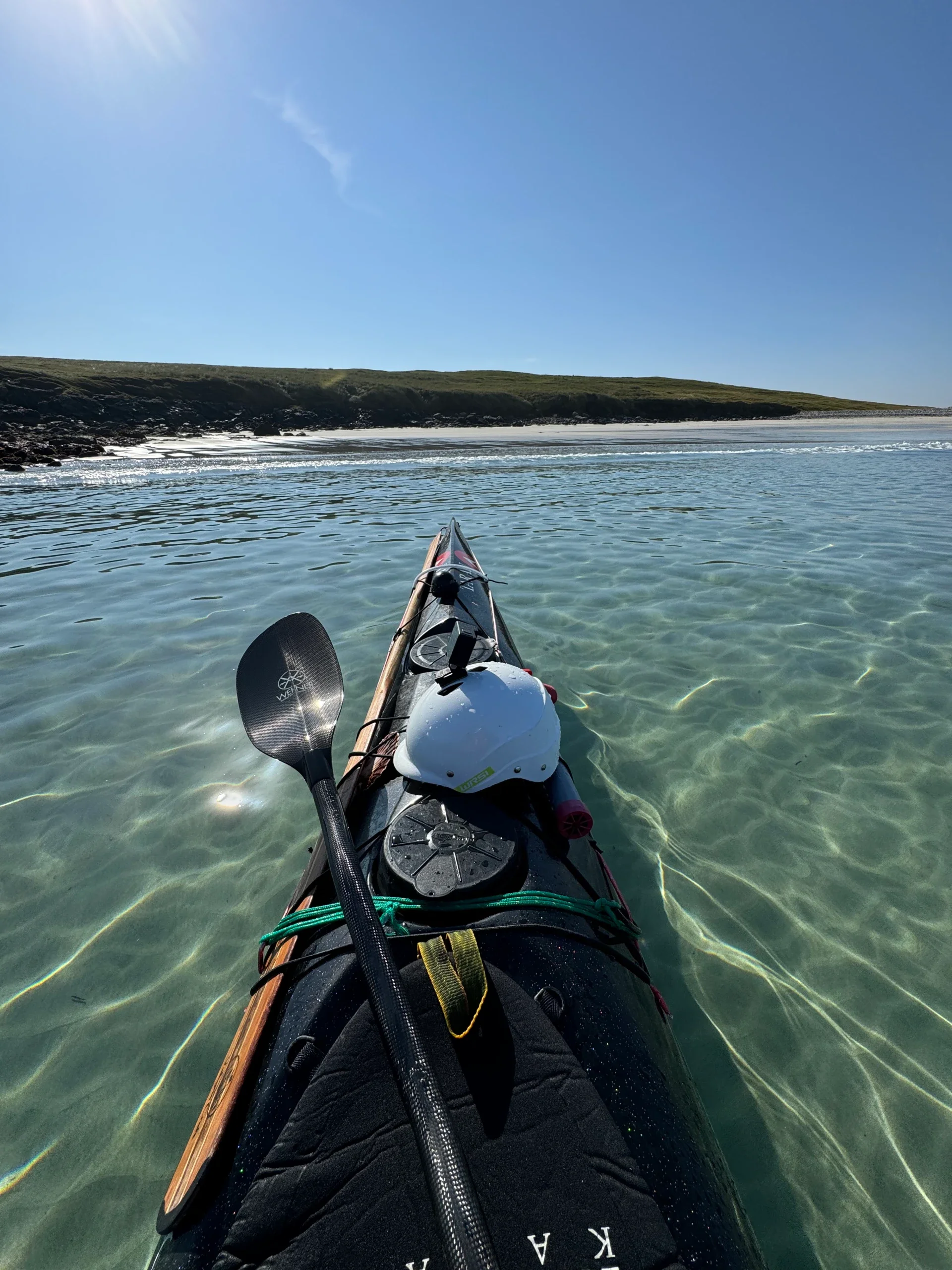 Off and it was such a flat calm and bright morning. Paddled to Inishbofin and enjoyed lunch on the most gorgeous tropical beach. As I was paddling in, the sea was so clear and blue, it could have been Greece. You could see the white rippled sand underneath and the burnt orange of the kelp drifting in the gentle waves. After lunch I was going to paddle on around the point but suddenly got so tired. Not like body tired but like I’m going to fall asleep, I need a nap tired. I think it was my lunch telling me it’s time for a nap. So I went to the next harbor to pee and shake up some coffee to keep me going. And what do I see while approaching? A van that looked quite like Donals and suddenly I see a drone wizzing towards me. I smiled at once, usually if a drone flies over me I’m thinking “what the hell” but knowing it’s Donal with my drone getting stellar footage, I was so excited. It’s so so nice to finally have some good video of me paddling from above. We chatted for a moment once I reached the pier and then we were both off again and I felt more ready to do the next stretch.