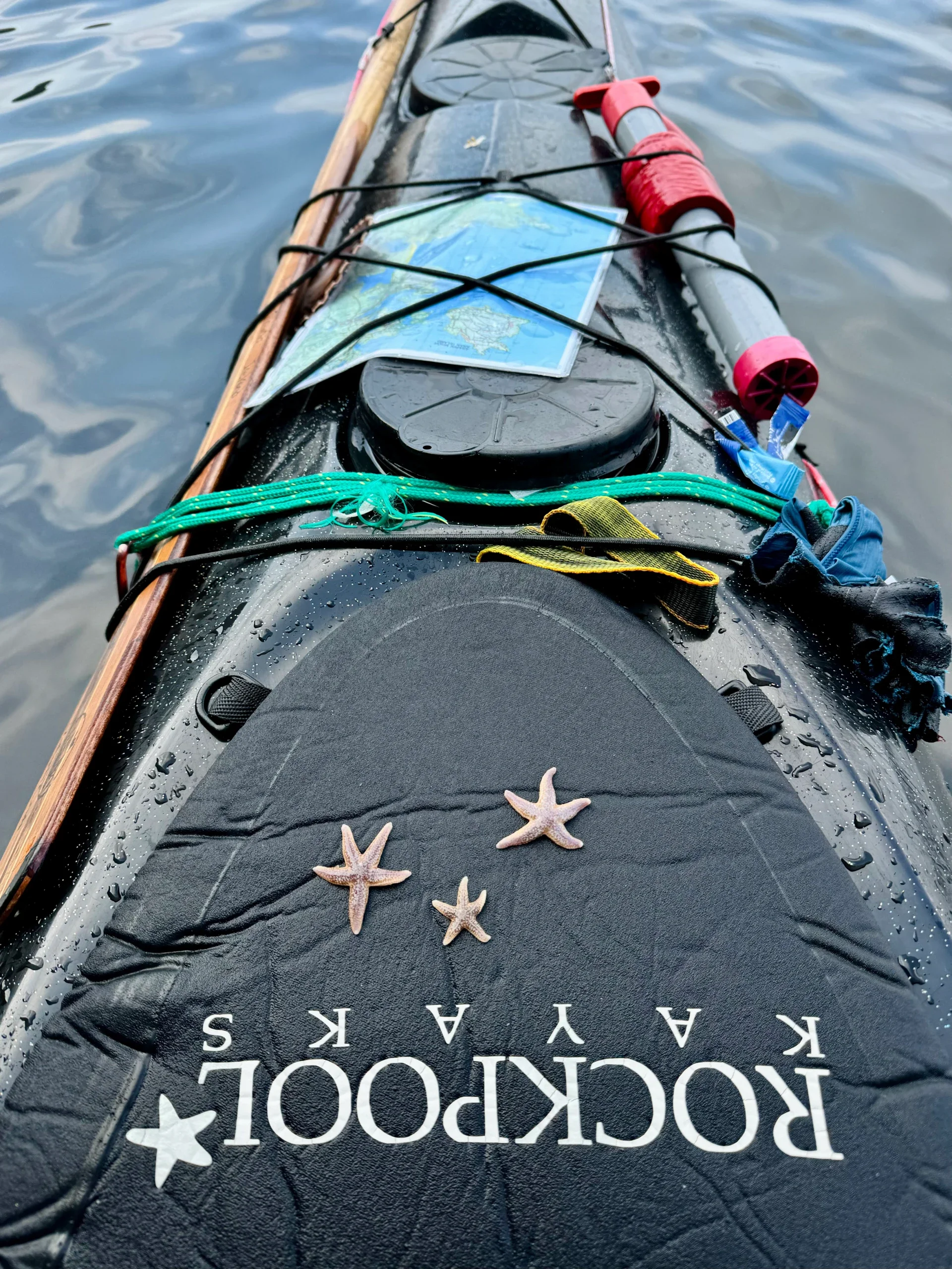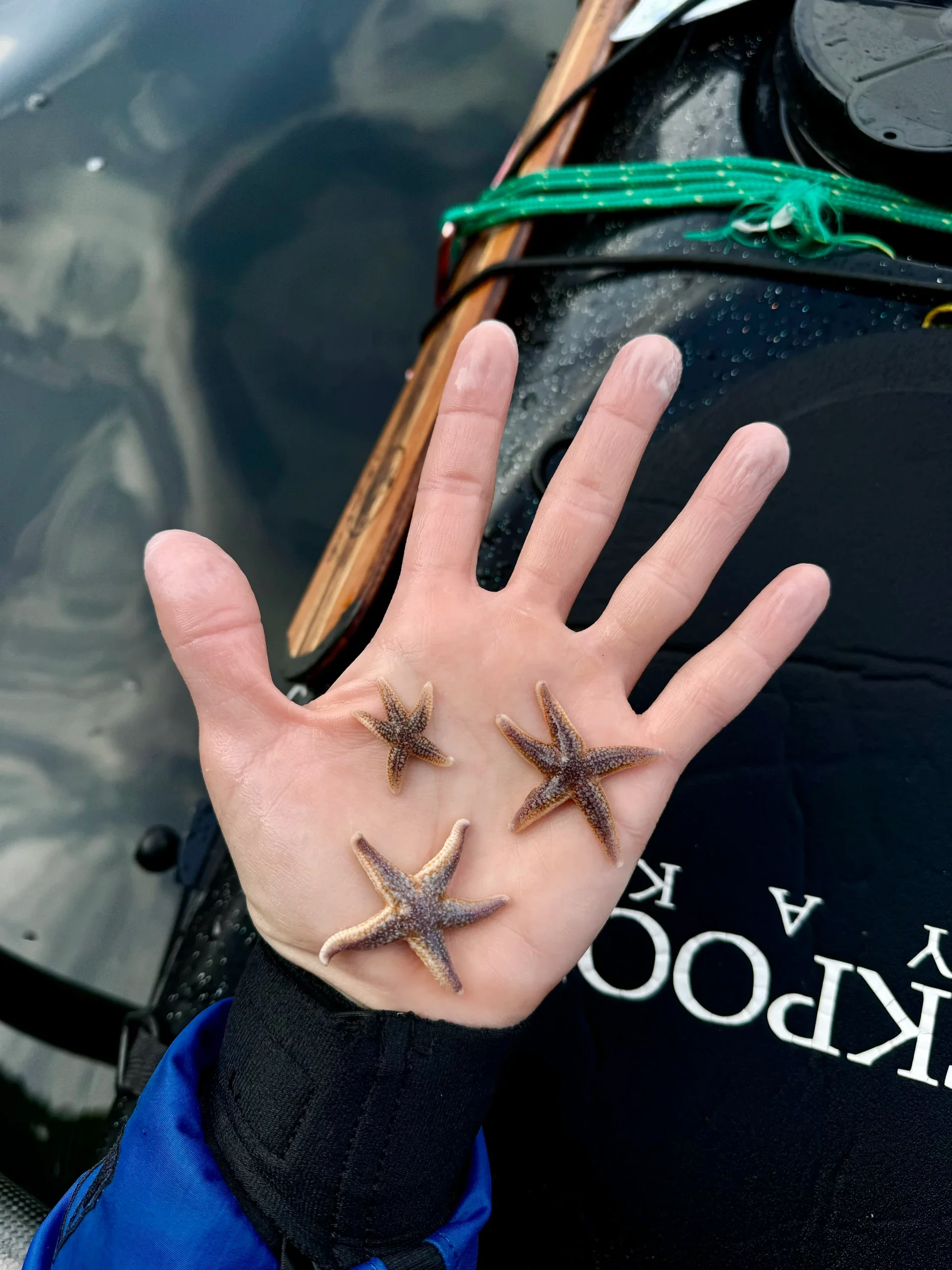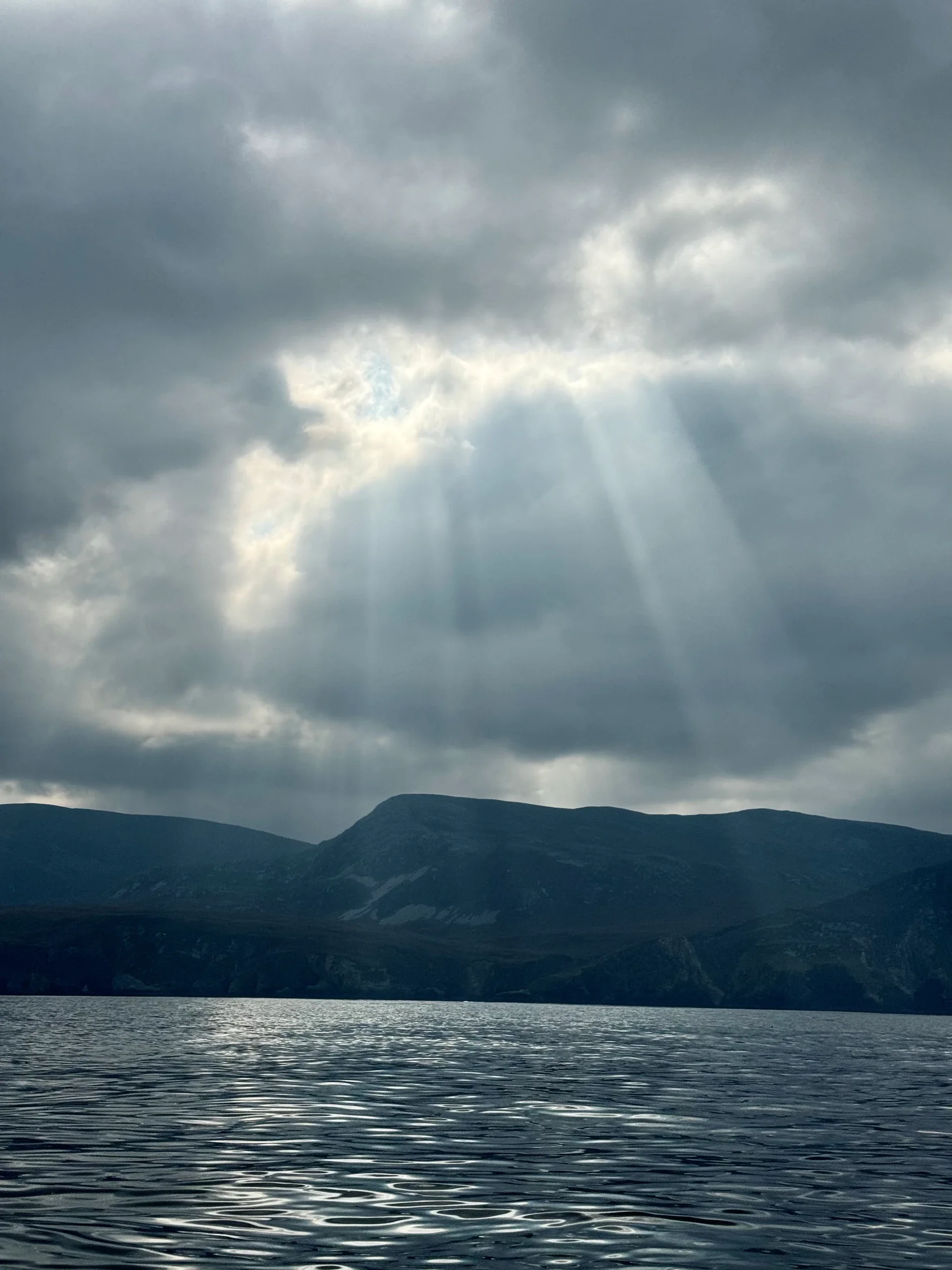 Back on the water and it just was one of those days where I had to have some hard "conversations" with myself. It's not like I'm going through any mad crisis in my life but we all have things going on, so being on the water in great for me to think and have my own space to process things. Such an incredible crossing towards Slieve Tooey, the sun was shining through the clouds in such dramatic rays of light through the clouds and everything was this gorgeous deep blue, the sea and sky alike. I lived in Norway for a winter and it reminded me of being there. I played my playlist while crossing from when I lived there. Very soft and glassy, moody day. When I got to the cliffs themselves, it was so beautiful to see them towering overhead. I saw some paddlers and wanted to keep my distance so I didnt have to chat in my meditative state, but when I saw one point towards and paddle to me, I thought aw man, theyre gonna do the thing where someone sees me and says "are you okay out here?? Do you need any help??" which I'm pretty tired of. As she got closer, she said "are you Ariel?" and we chatted for a bit. Turns out she has been following my whole trip as well which is happening more and more, and she gave me some twix and was off again. I wove through the cliffs and arches then and was amazed to see so many tiny little starfish that were the size of my finger, so I put a couple on my spray deck and they were just the size of the rockpool starfish printed on my deck which was cute. At one point when I was paused I could watch the seals swim underneath me and theyre colors bright and then their heads pop up to look at me. Rounded the corner further to a pier I had been to years ago when hiking some of Donegals mountains. It was a cool feeling to paddle up and think ah wow I've been here before. Finally still paddling as the sun set with my body aching and in pain from long days, I got to the most gorgous beach which was in a cove type area with white sand in a horse shoe shape and high cliffs behind it. Which was beautiful but also the thought of trying to get more water here started to dissipate. There is a way up from a stair case but its quite long and then I have to walk to the houses somewhere up there to ask for water. It got dark fast so I really didnt fancy that but when I pulled all my water bottles out, I did realize that I was out of water. Shoot. I saw a stream coming down the side of the cliff on my way in so Ill try that tomorrow. I had a meal replacement shake and tin of chicken meatballs for dinner because I was not about to get my stove out nor did I have water to cook anything with. I just took my joint supplement with the tomato sauce that came in the tin. Nice.